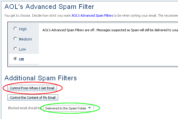 4. You should now see the Spam Filter page (see below). First, change the 'Blocked Email Should Be:' drop down menu to 'Deliver to Spam Folder'(circled in green), this will make sure if 'englishlads.com' is seen as spam then it can be recovered. Next, Select the 'Control From Whom I Get Email' button (circled in red), a new window should appear.