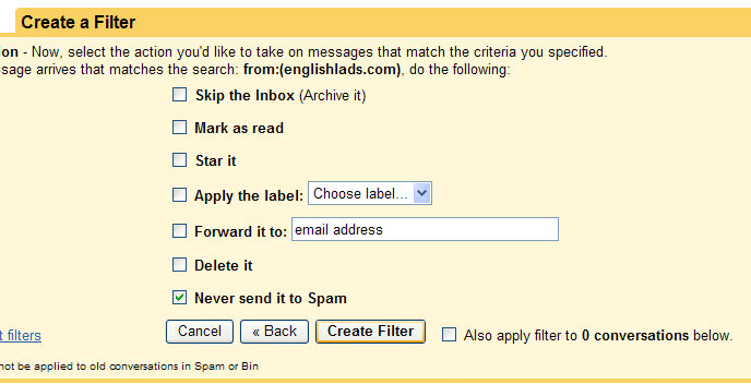 5. Check the box 'Never send it to Spam', then click 'Create Filter'