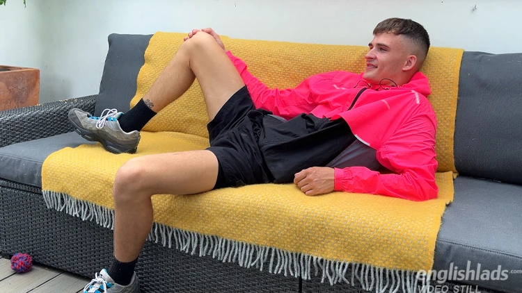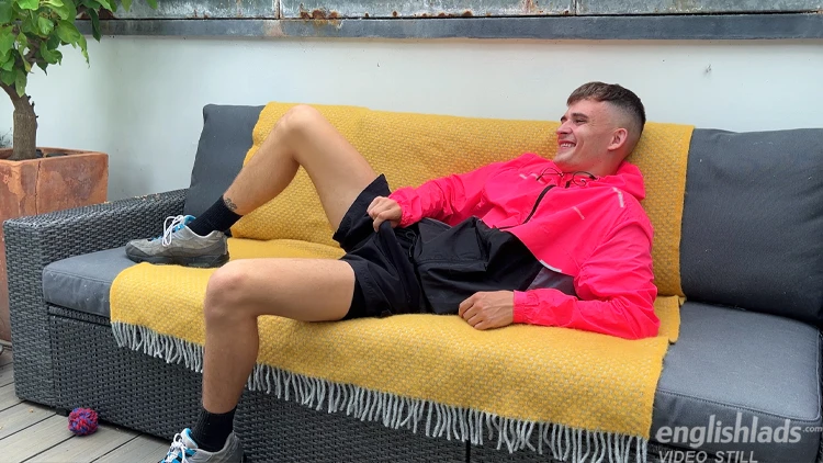 Young, straight & lean footballer Seb Butler returns today as he continues to push his boundaries! Seb is looking relaxed and sporty, and when he pulls his uncut cock out through the bottom of his shorts, we see he is already rock hard with a massive erection! Seb enjoys playing with his monster cock and even lets me have a go wanking it! We are shooting on the rooftop, and it feels like one of those days where anything can happen! And not just weatherwise, as when I surprise Seb with the little black dildo, he agrees to experiment, pumping his tight, hairy hole with it! Seb does a great job of pumping his hole and wanking his cock before he gets close and squirts a huge load of cum!